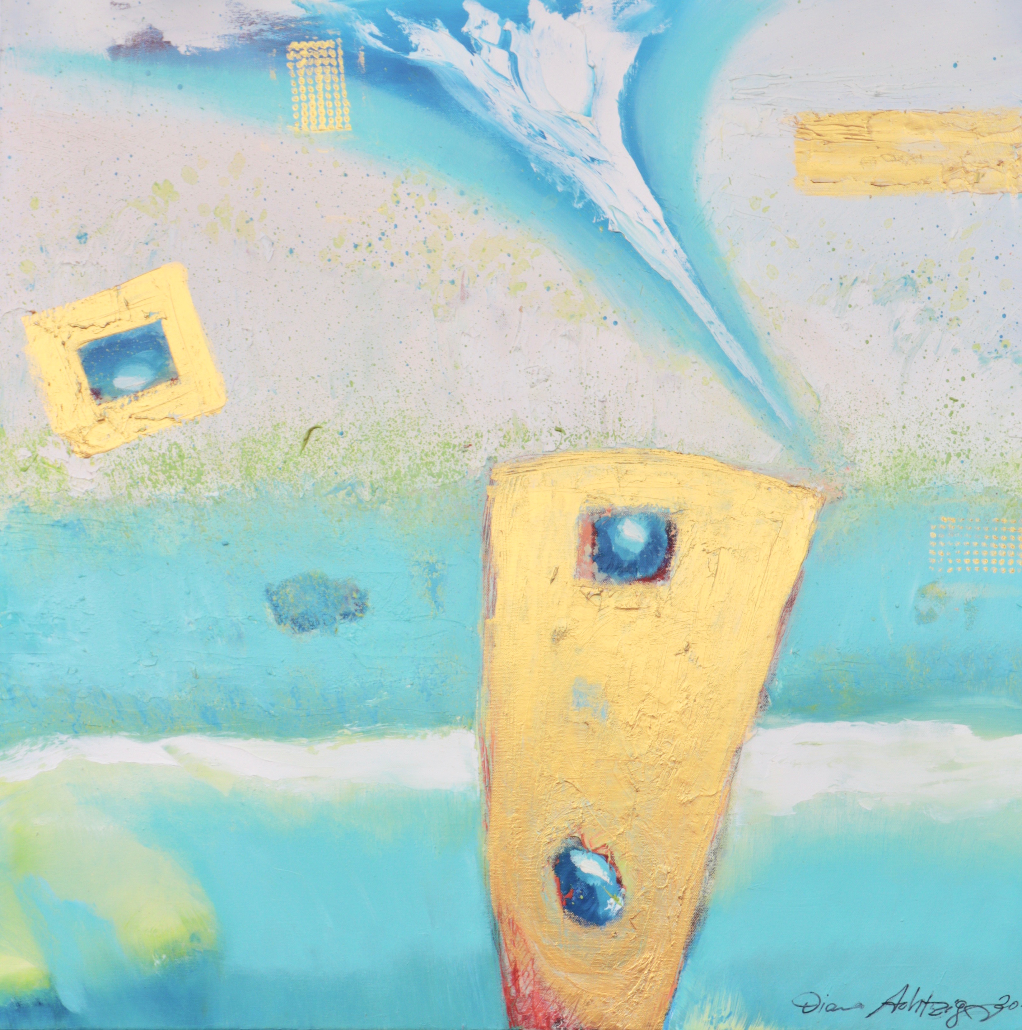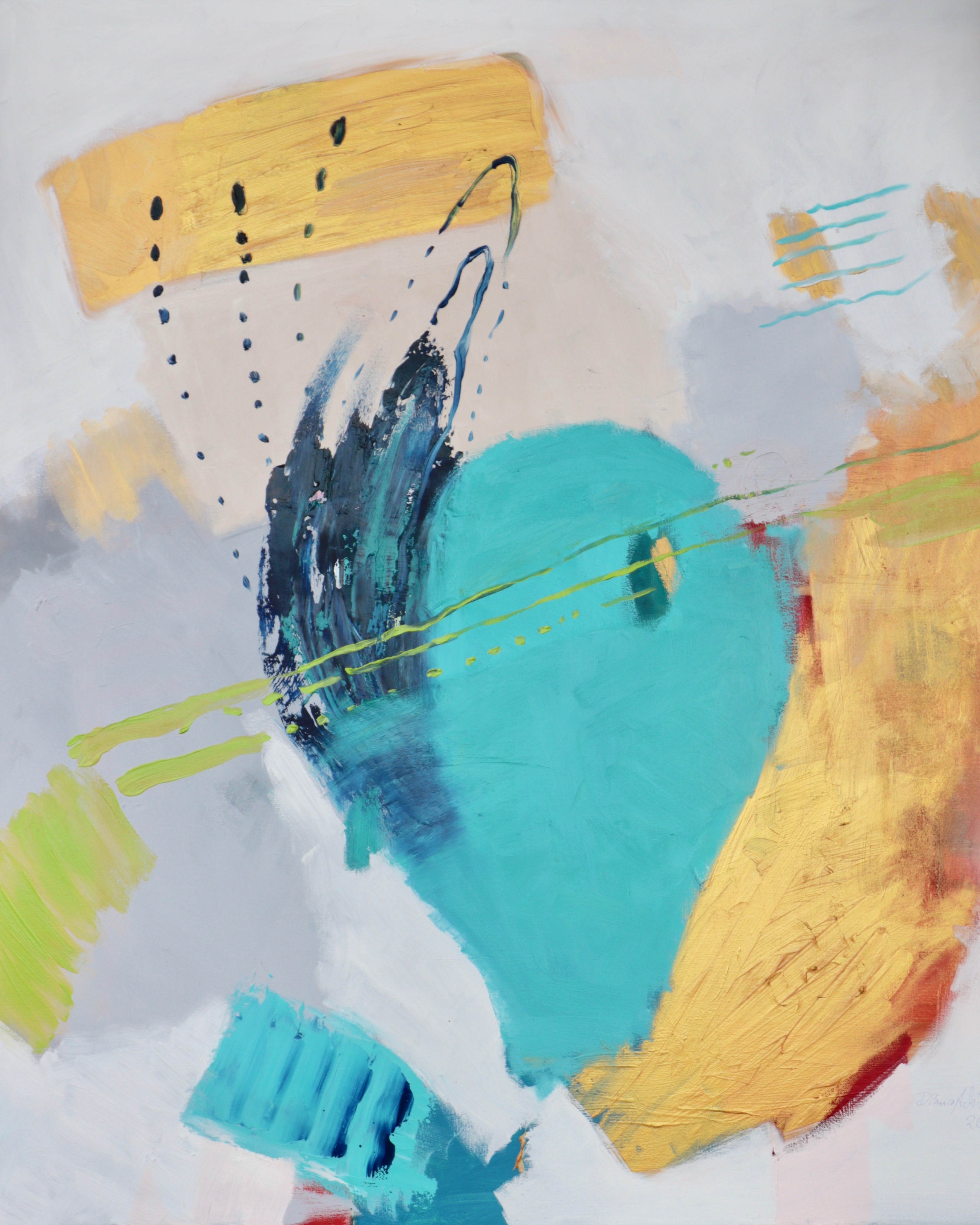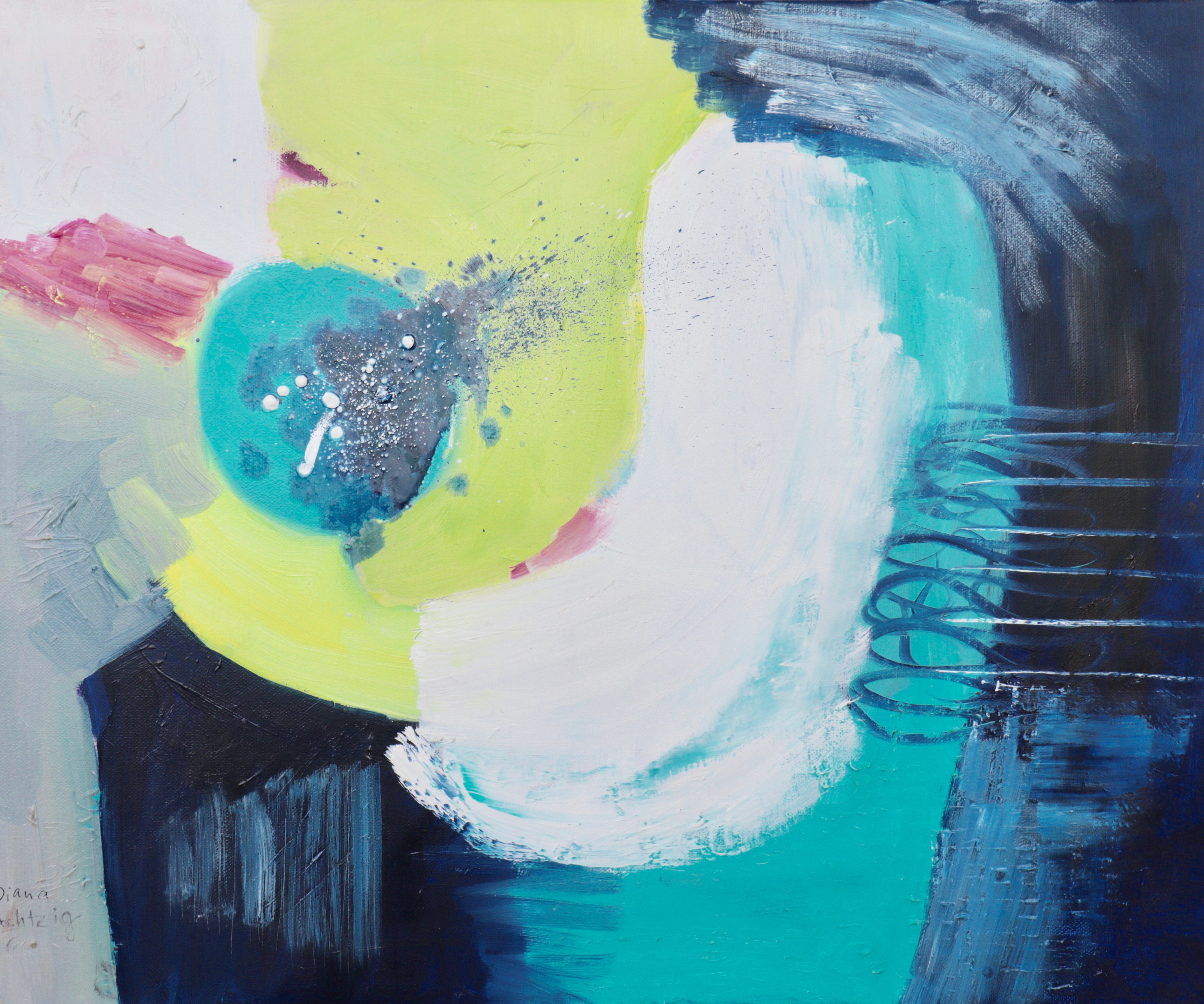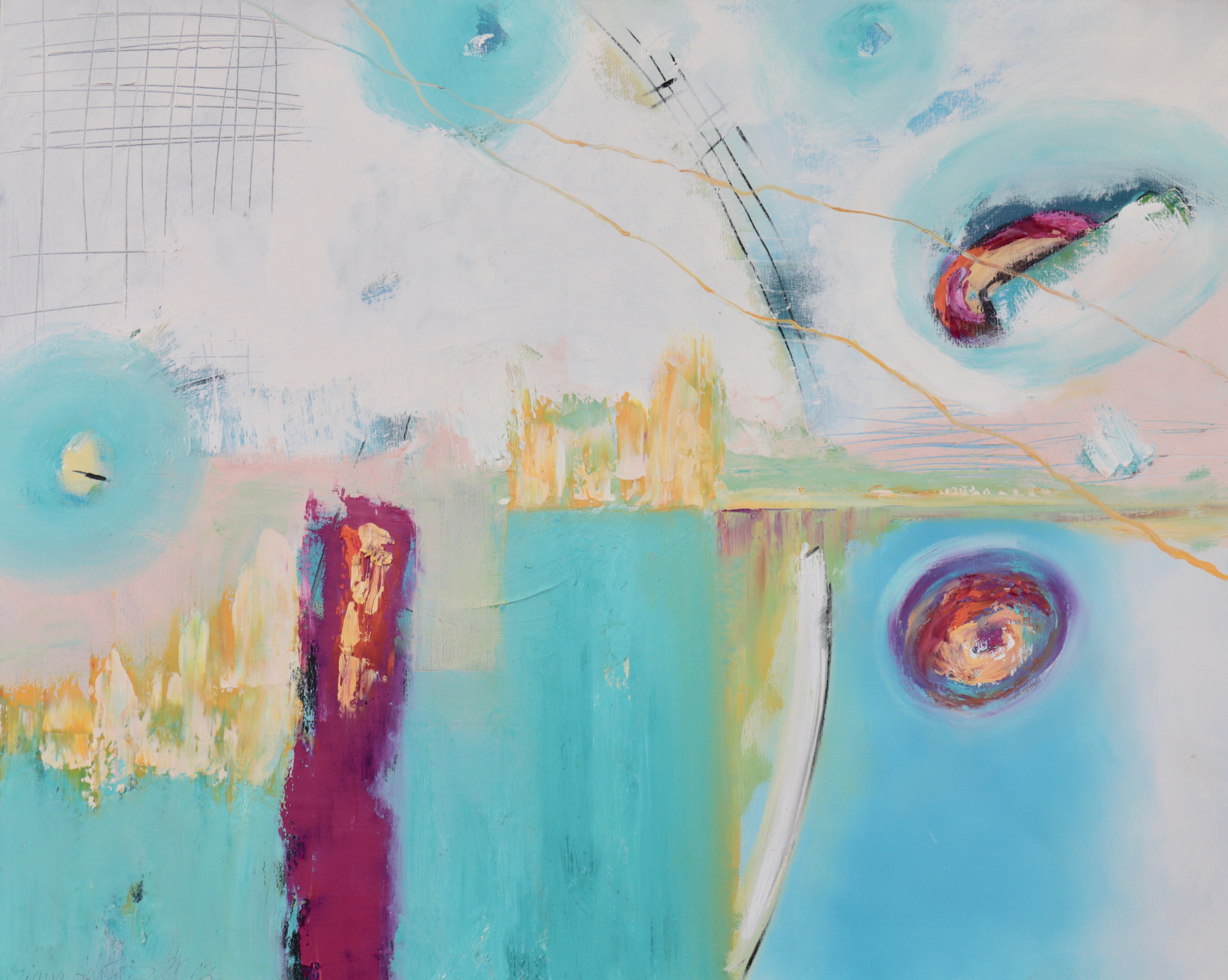 Die ungegenständliche Ölmalerin geht auf die Fragestellung des Artikels wie folgt ein: „Wie sieht eine visionäre abstrakte Transzendenz in der neuen Acryl- und Ölmalerei aus?“ In ihrer abstrakten Ölfarbfeldmalerei untersucht die moderne Künstlerin abstrakte Transzendenz mit Farben in ihrer tiefen psychologischen Wirkung. Sie kreiert somit eine eigene Gefühls- und Bildwelt, dessen Raumwirkung von Proportionsverhältnissen der Farbflächen, über Linien, Lasuren, hin zu eigenen Transparenzen erschaffen werden. Dabei gibt es gemalte, gegossene, wieder abgeriebene, gerakelte und gespachtelte Bildteile. Oft lassen sich dabei gemischte und nur vereinzelte Reinfarben auf den Leinwänden finden.