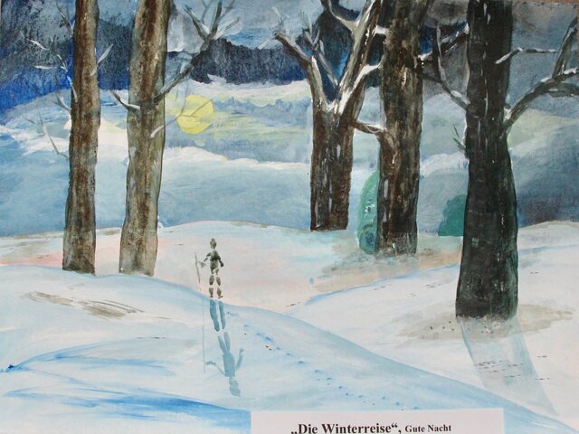 Ausgehend von dem Lied „Die Krähe“ hat die Malerin diesen oft verkannten Tieren in ihren Bildern nachgespürt. Diese Aquarelle ergänzen den Liederzyklus von Schubert. Weitere Themen, die die Aquarellmalerin immer wieder herausfordern, sind die ökologischen Landschaften und die Natur, seien es Bäume oder Blumen. Auch hier ist der Bezug zum Ausstellungstitel wieder zu finden. Das Lied „Der Lindenbaum“ von Schubert ist zum Beispiel zum Volkslied geworden. Ein Teil der Ausstellung gestaltet die Künstlerin mit Bäumen mit Aquarellfarben.