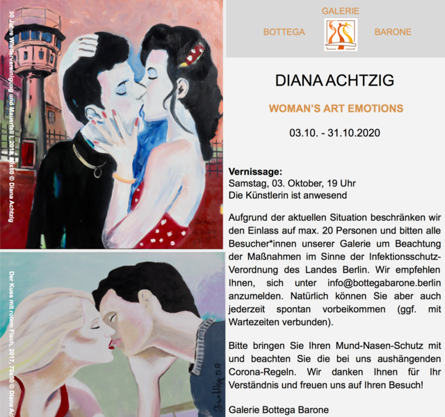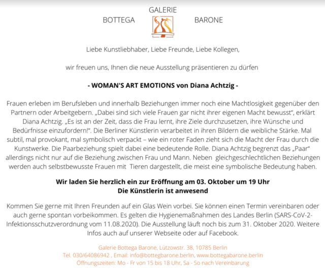 Weitere Informationen finden Sie unter: http://bottegabarone.berlin/event/eroffnung-ausstellung-womans-art-emotions/.