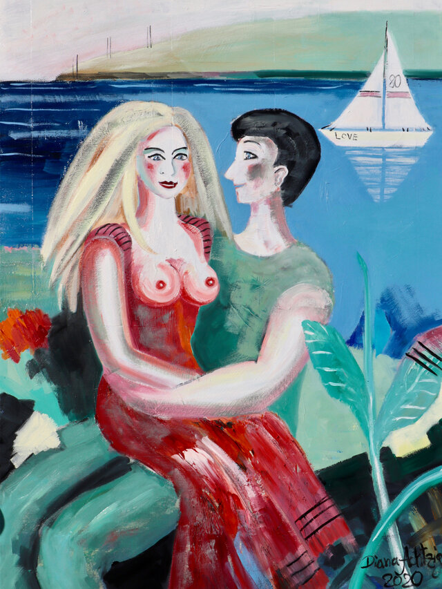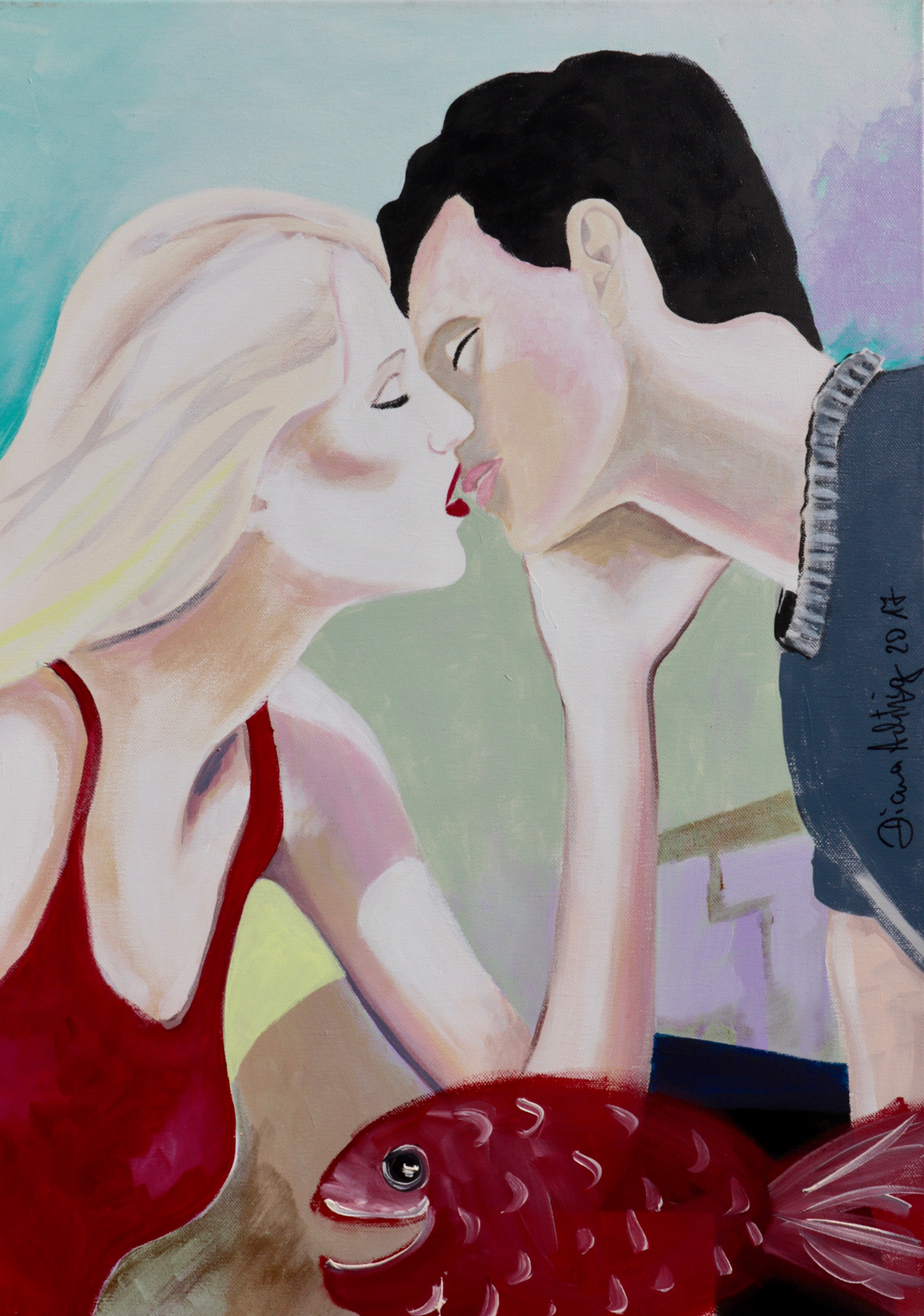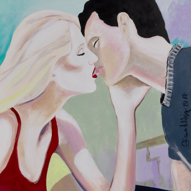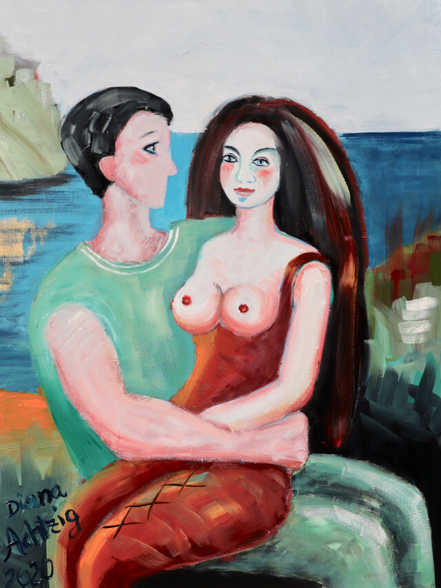 Gerade Frauen erleben, trotz bedeutender Kulturrevolutionen und der Gleichberechtigung, vor allem in Beziehungen diese Machtlosigkeit. „Viele Frauen haben keine Lust auf Machtspielchen und wünschen sich einen Partner, der sie einfach nur unterstützt. Sie sind sich ihrer eigenen Macht nicht bewusst, vielleicht weil sie nicht formulieren können, was sie wollen“, erklärt Diana Achtzig. „Es ist an der Zeit, dass die Frau lernt, ihre Ziele durchzusetzen, ihre Wünsche und Bedürfnisse einzufordern!“ Die Berliner Künstlerin verarbeitet in ihren Bildern diese beiden Themen: das Bedürfnis nach Nähe und die weibliche Stärke. Mal subtil, mal provokant, mal symbolisch verpackt – wie ein roter Faden zieht sich die Macht der Frau durch die Werke der Künstlerin. Die Paarbeziehung spielt dabei eine bedeutende Rolle. Diana Achtzig begrenzt dabei das „Paar“ nicht nur auf die Beziehung zwischen Frau und Mann. Neben gleichgeschlechtlichen Beziehungen werden auch selbstbewusste Frauen mit Tieren dargestellt, die meist eine symbolische Bedeutung haben.