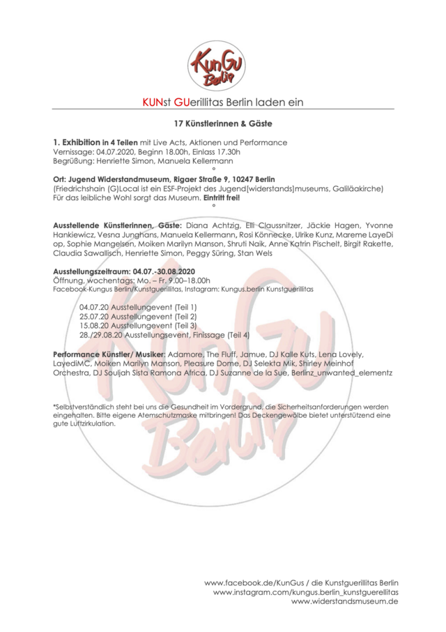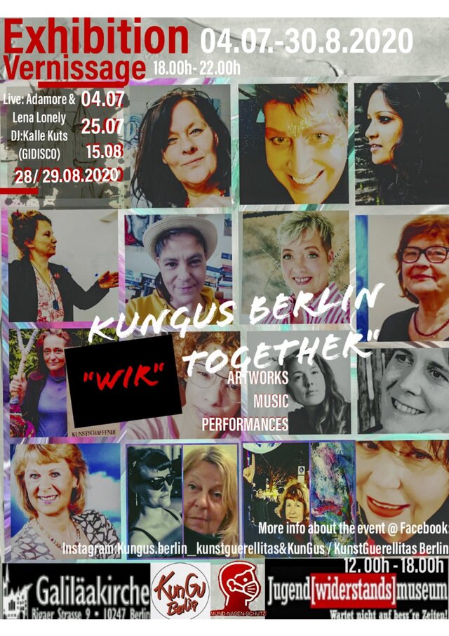 Die KunGus freuen sich, einem ebenso vielseitigem Publikum die Werke von 17 Künstlerinnen und Gästen in einer Gemeinschaftsausstellung zu präsentieren. Gelegenheit, diese zu besuchen, gibt es vom 4.7. bis zum 30.8.2020 im Jugend[Widerstands]Museum, in der Galiläakirchen, Rigaer Straße 9, Berlin -Friedrichshain. Zur Vernissage wird am 4.7. um 17.30 eingelassen, so dass das liebevoll vorbereitete Programm ab 18.00 Uhr starten kann. Neben ausstellenden Künstler*innen, gibt es Livemusic und Performances, alles natürlich den Sicherheitsanforderungen entsprechend und ebenso für das leibliche Wohl sorgend.