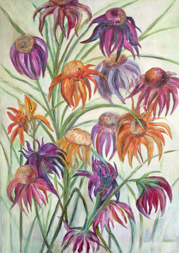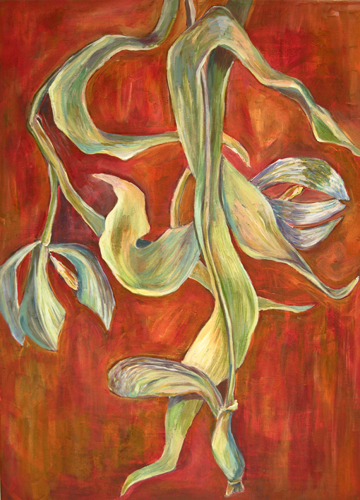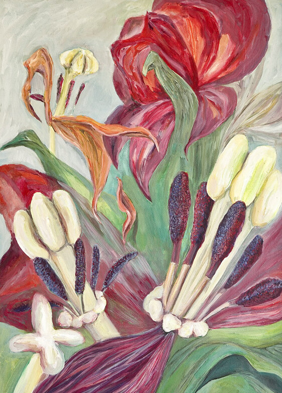 In der Werkgruppe „Florales“ thematisiert die Malerin Ria Siegert neben der Farbenpracht und Fülle von Blüten, die in vielen Kulturen ein Sinnbild der Lebensfreude sind, auch das Verblühen als Prozess anmutiger Vergänglichkeit.