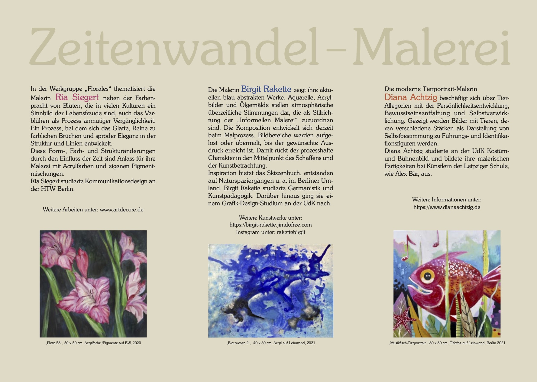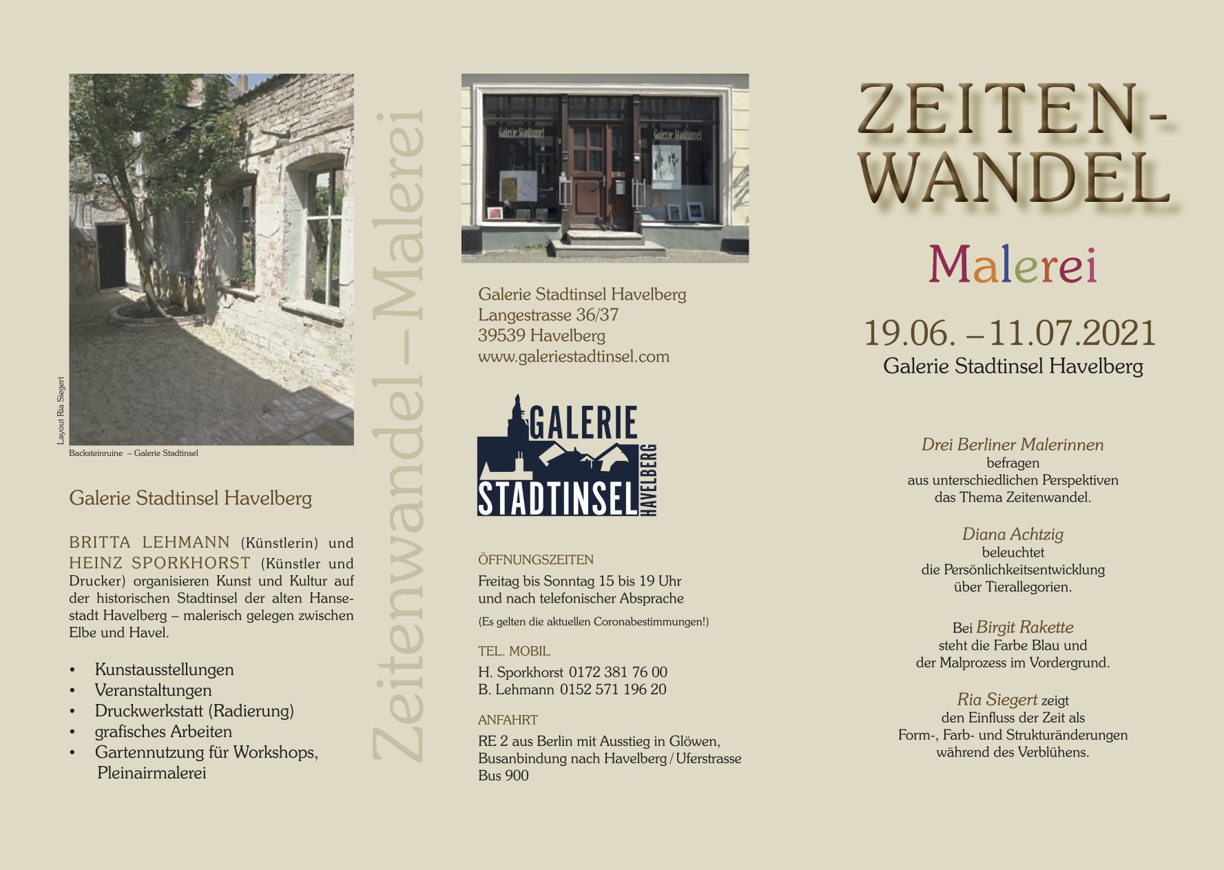 Die Galerie StadtInsel Havelberg von Heinz Sporkhorst und Britta Lehmann zeigt unter dem Titel "Zeitenwandel - Malerei" die drei Berliner Malerinnen Ria Siegert, Birgit Rakette und Diana Achtzig. Um ihre Werke über den analogen Galeriebesuch hinaus zeigen zu können, entwickelten die Künstlerinnen ein digitales Videokonzept.